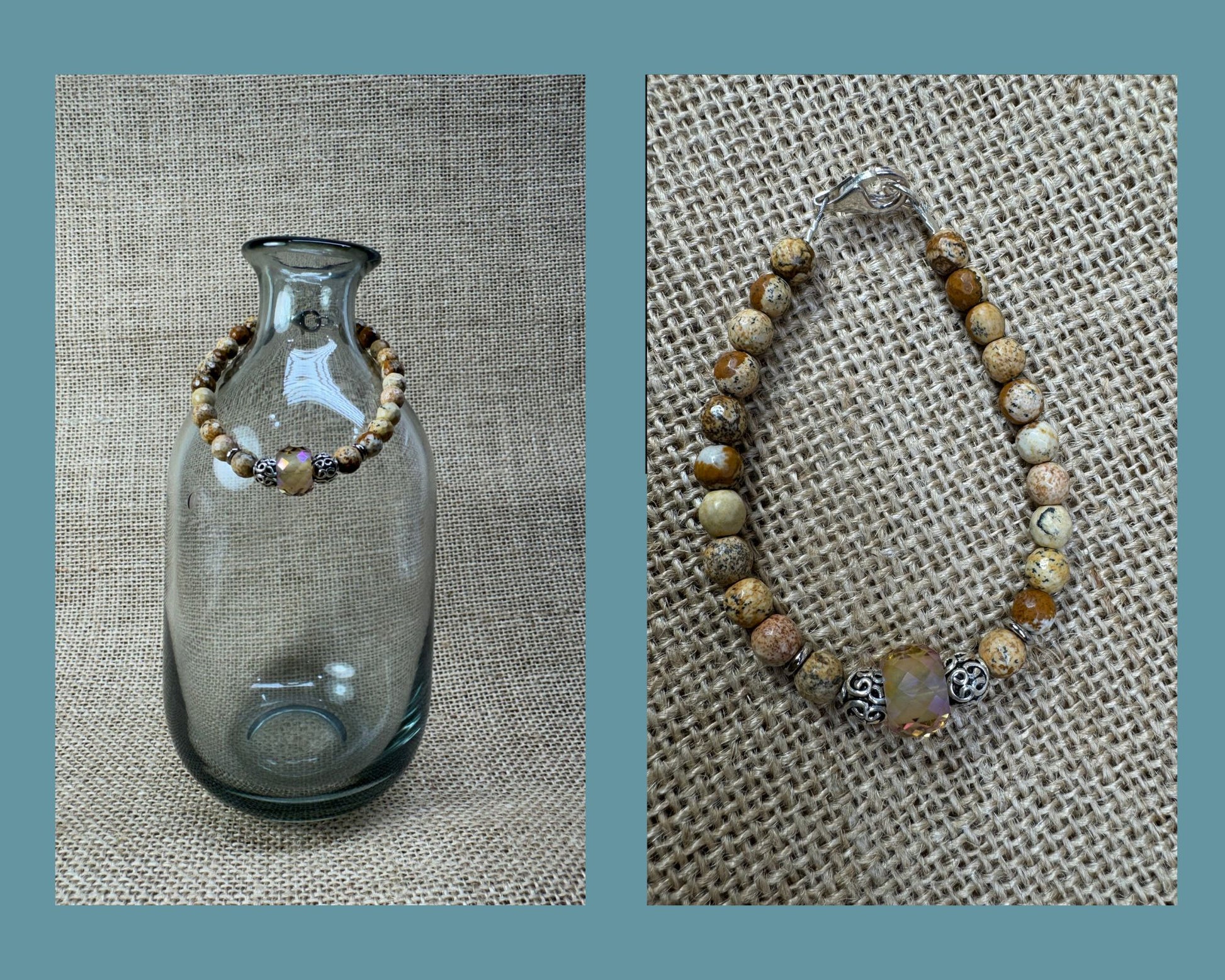 This bracelet is made of pretty faceted picture jasper beads with a beautiful champagne crystal center bead accent.