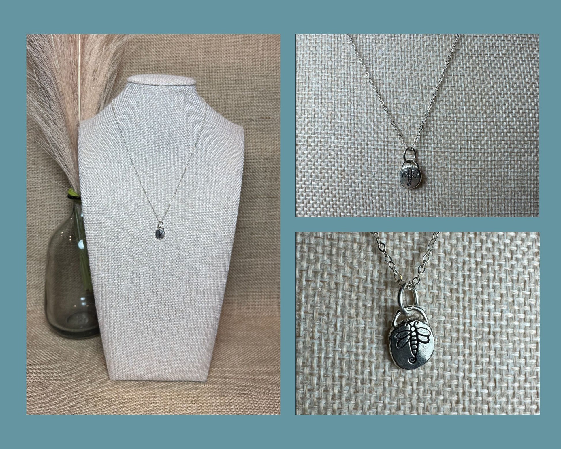 This is a dainty necklace with a hand pressed sterling silver dragonfly pendant.