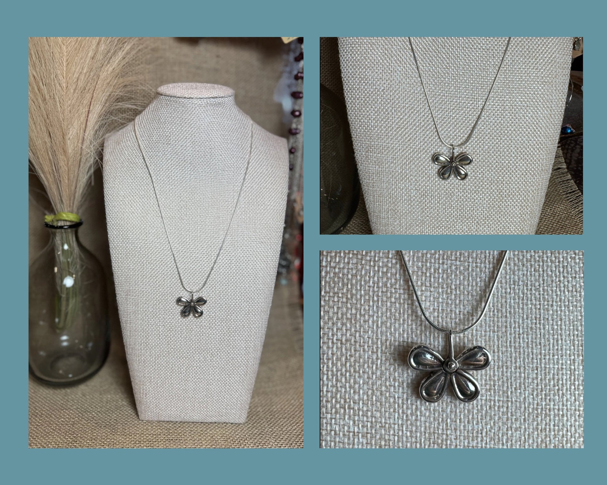This necklace features a sterling silver sand casted daisy flower pendant.