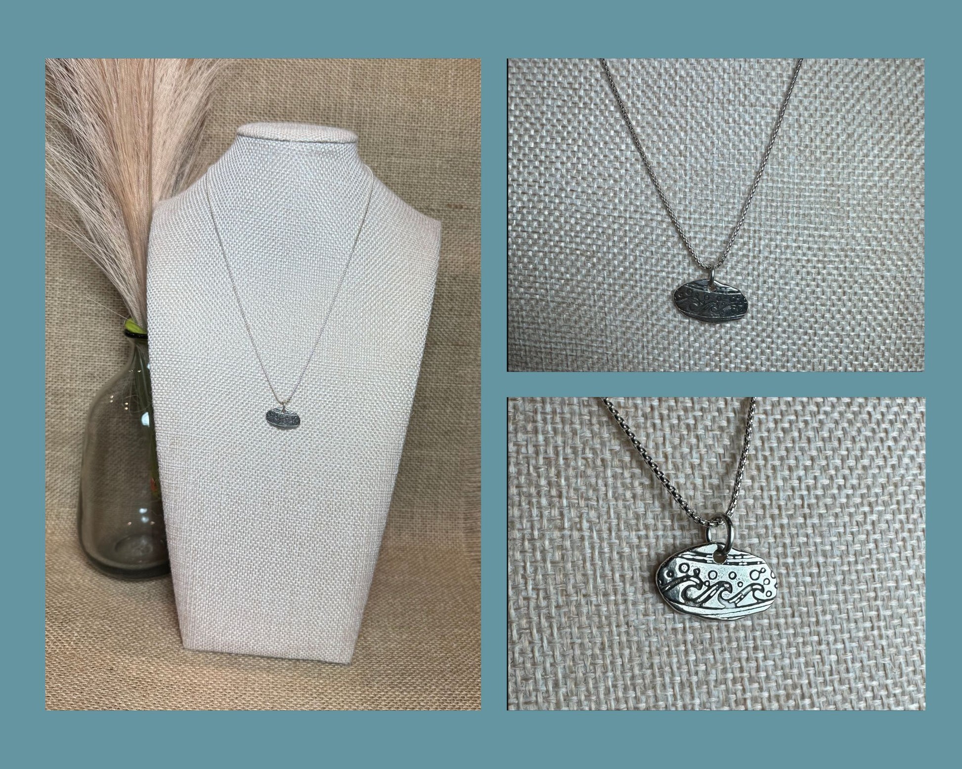 This delicate necklace features a little stamped sterling silver three waves pendant.